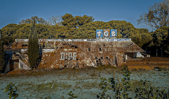 El camping La Ballena Alegre cerró sus puertas el año 2005, expropiado por AENA como zona de protección aeroportuaria y en teoría destinado a futuras ampliaciones (oh, tan necesarias) del aeropuerto de El Prat, pero quien se hizo con las tierras las dejó tal y como estaban, con patente desinterés. En La Ballena Alegre la naturaleza ha tomado hoy el volante de un modo conspicuo, casi vengativo, y se halla a medio borrar cualquier traza de humanidad previa: la pinaza se amontona donde nacen las paredes del antiguo supermercado, como si buscara engullir el edificio; las raíces de los pinos rompen el asfalto aquí y allá, subiendo a la superficie de un modo que hace pensar en krakens de grabados antiguos.